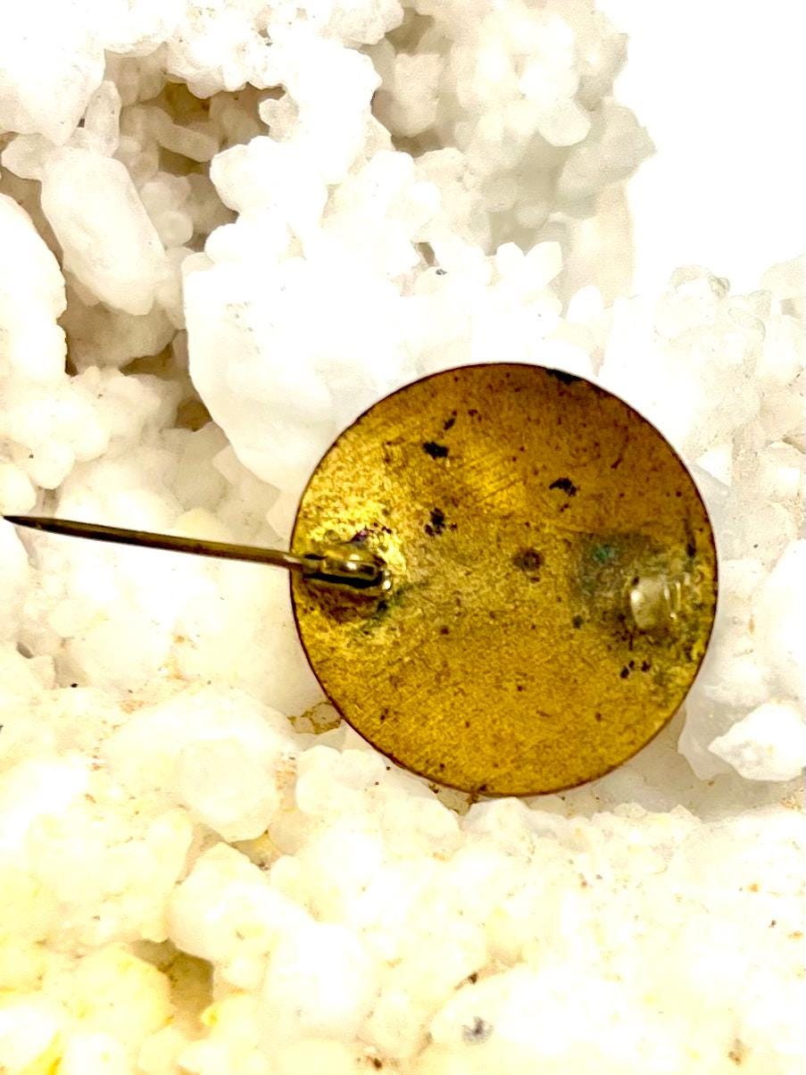 This petite vintage brooch features a warm brass base with a deep red enamel finish, creating a simple yet striking accent piece. Measuring approximately 1" in diameter, it reflects the mid-century design sensibility of small, wearable pops of color that added polish to hats, scarves, and lapels.