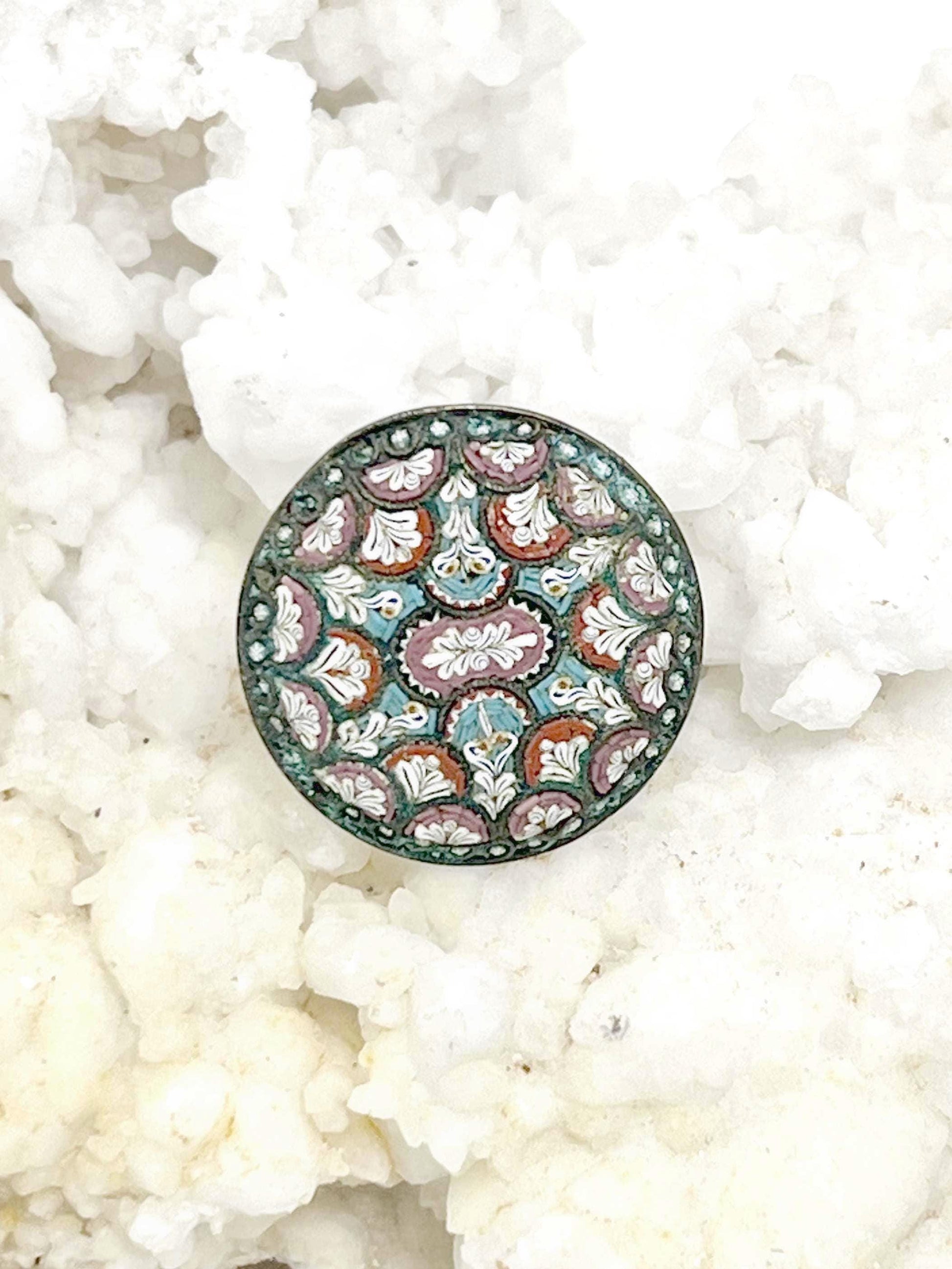 This intricate vintage brooch showcases the art of Italian micro mosaic work, where tiny glass tesserae are hand-set into a brass frame to create a delicate floral design. Measuring approximately 1" in diameter, the brooch features lace-like detailing with vivid glass inlays, a testament to the skilled craftsmanship of mid-century Italian artisans.